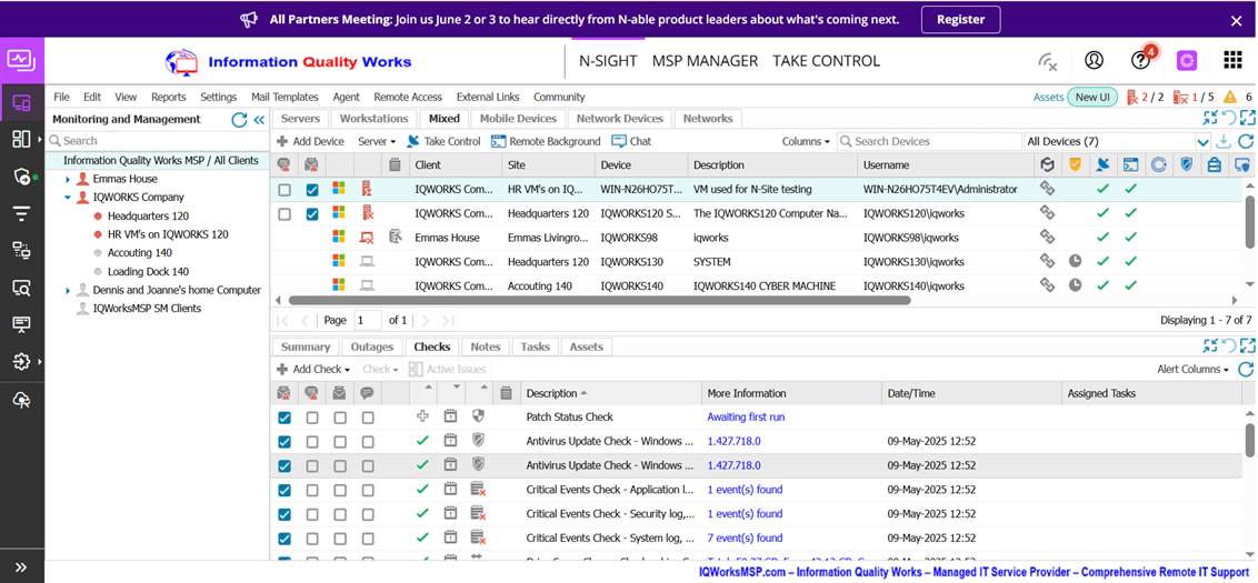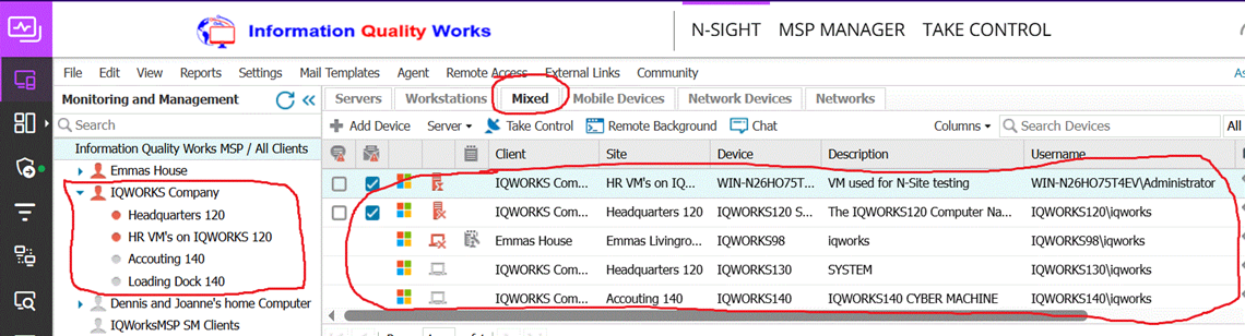 the Dashboard showing the IQWORKS Company devices under the mixed tab